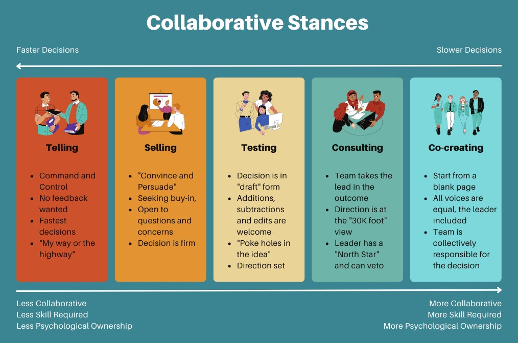 Telling, Selling, Testing, Consulting, and Co-creating represent the five stances, as represented by a ladder with telling on the bottom left all the way up to co-creation on the top right. Collaboration, as well as input from the group or team, increases moving to the right while speed of decisions (in the short-term at least) decreases. It's crucial for a leader to build trust with the team over time, and one way to do that is to clarify the kind of feedback they're seeking from their team. This framework provides aids in communicating everything from “it’s my way or the highway” to “I trust the team to figure it out together” and prevents the unnecessary frustration of providing or receiving feedback where it is unwanted or not going to be considered.